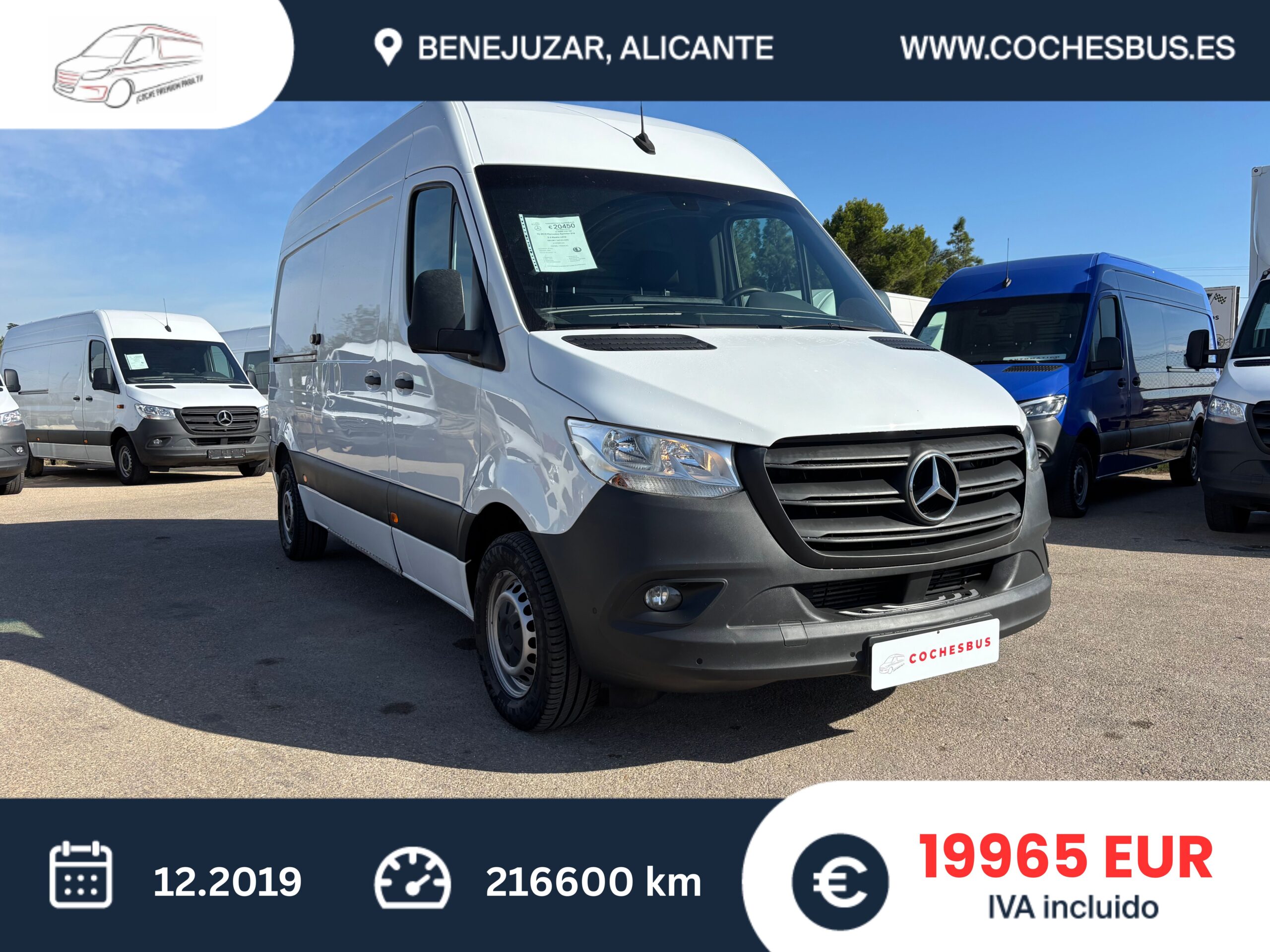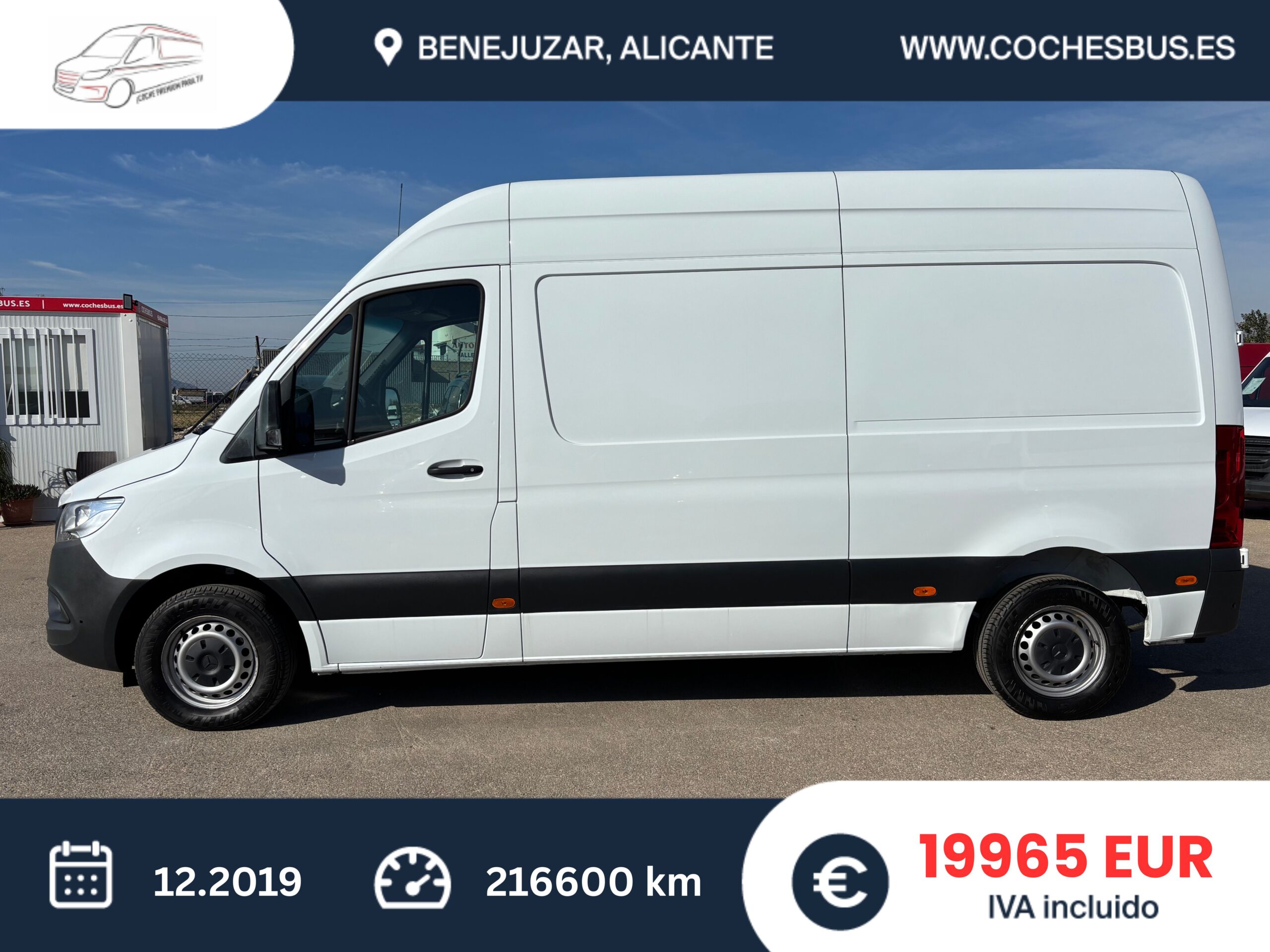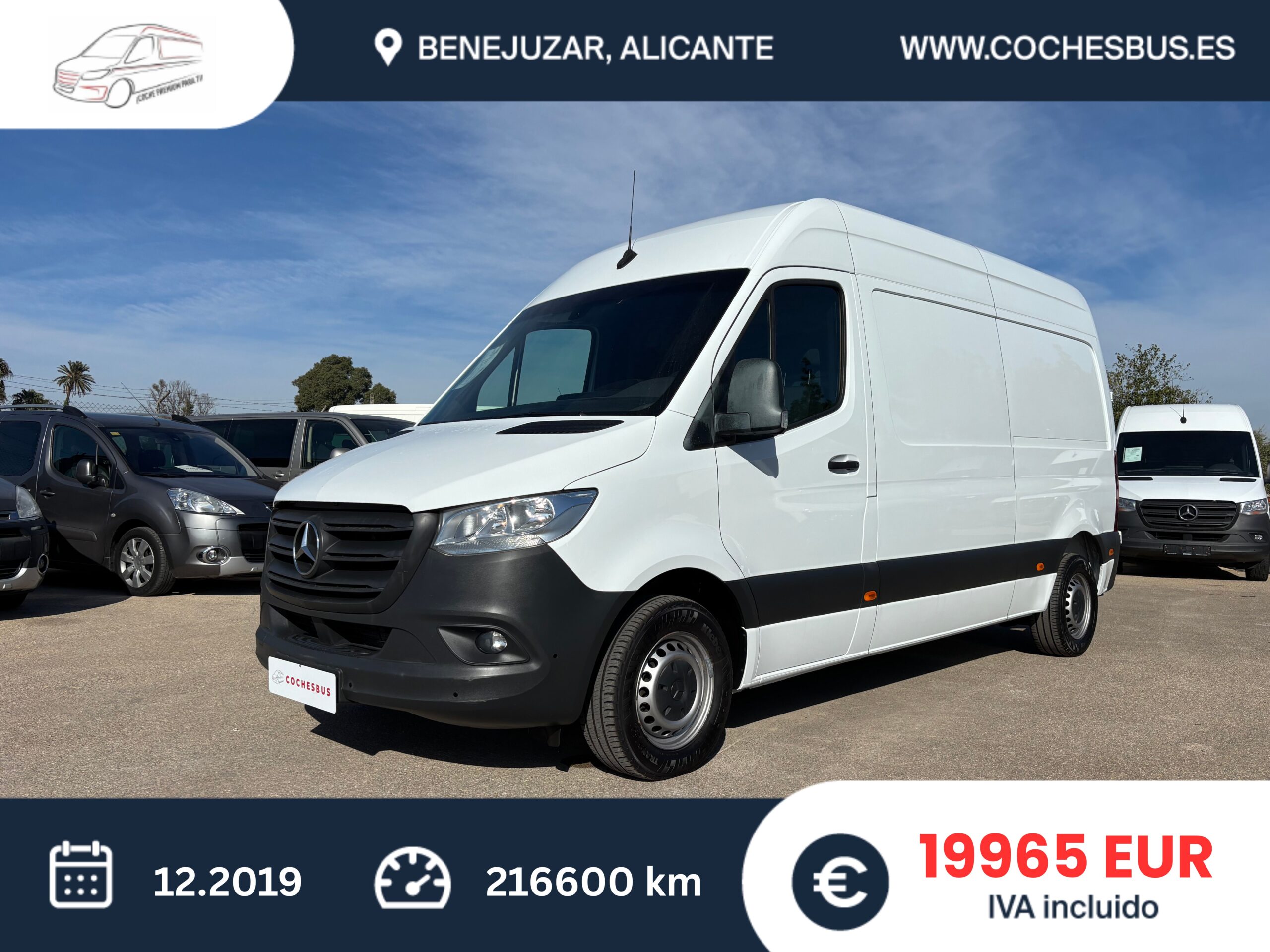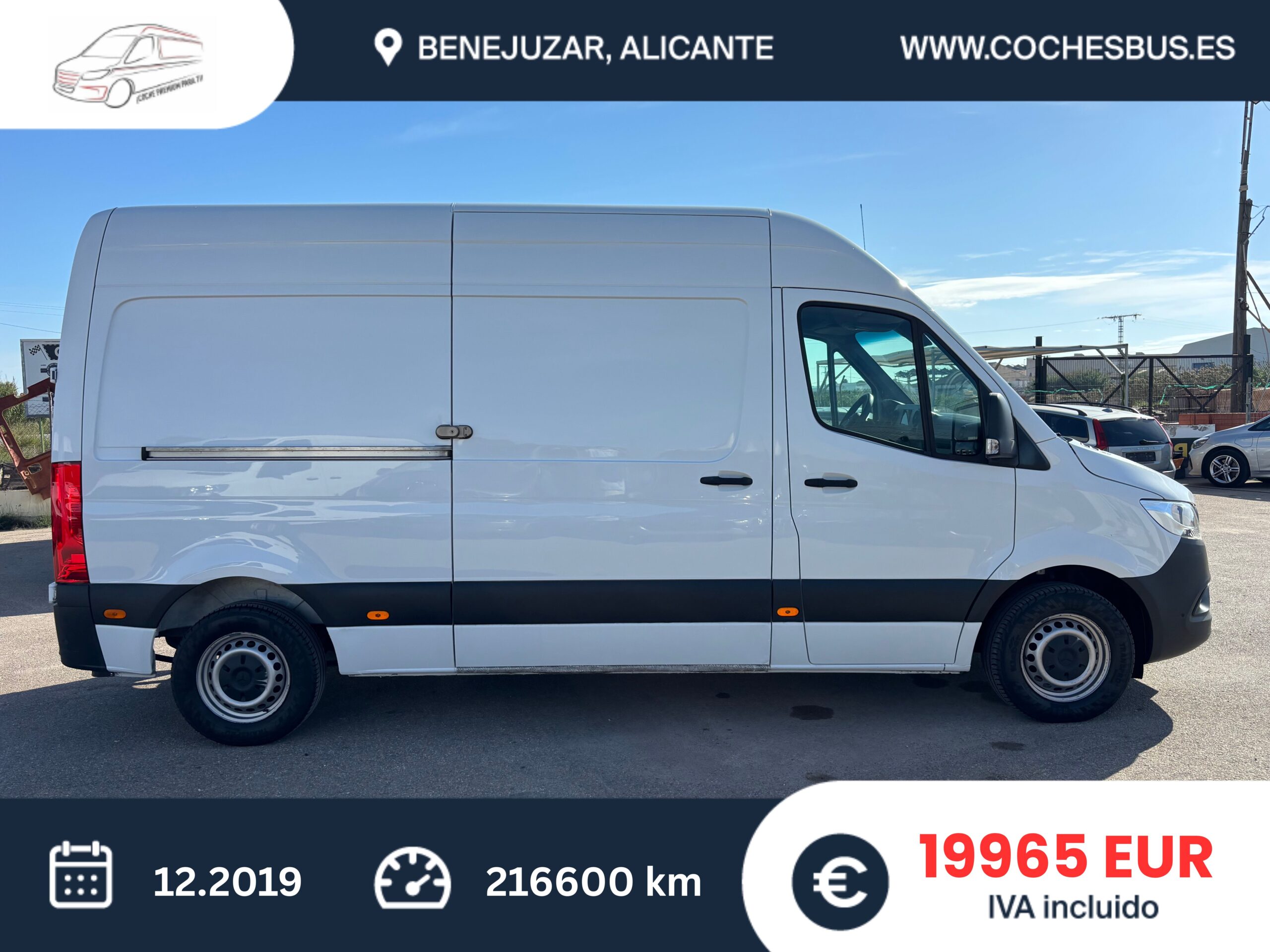• Mercedes-Benz Sprinter 314 L2H2 16900€ más IVA, 20450€ IVA incluido IVA deducible para empresas y autónomos. Para particulares más importación impuesto. Fecha de primera matriculación: 12.2019 Kilometraje: 216600 Combustible: Diésel Potencia: 105KW / 143CV Cilindrada: 2143 cc Caja de cambios: manual Carrocería: Furgoneta techo alto L2H2 Llaves: 2 Daños previos / accidente: No Tipo de Emisiones: EURO 6D Asientos: 3 Color: Blanco Tapicería: Tela (Original) Número de puertas: 4 Tenemos más que 15 furgonetas en stock.